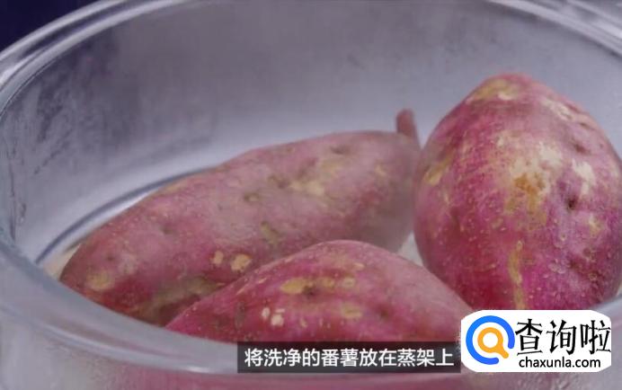 在等待芝麻馅冷冻的同时,将洗净的番薯放在蒸架上,大火蒸30分钟。