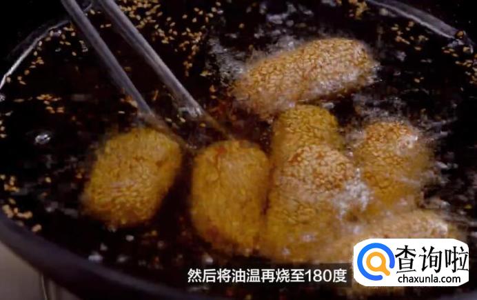 然后将油温再烧至180度,放入薯枣复炸,用中大火炸约1分钟,至薯枣表面呈金黄色。。
