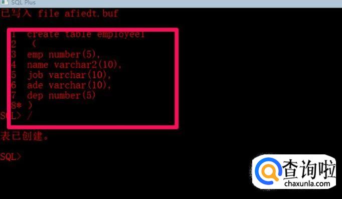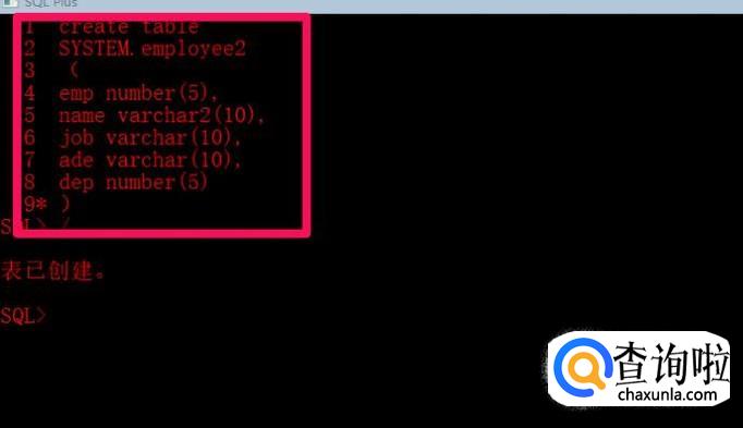 首先用户必须要有CREATE TABLE系统权限,并且只能在自己的模式中创建表,图中的例子使用CREATE TABLE语句在当前模式中创建了一个共有5列的表:表的名称为employee1,包含 emp, name, job,age,dep 等5列,后面的number、 varchar2、等为数据类型,括号里面为长度