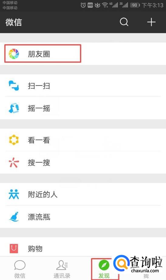 首先,我们打开我们的手机,然后登录进入微信,然后我们点击发现,之后我们点击朋友圈;