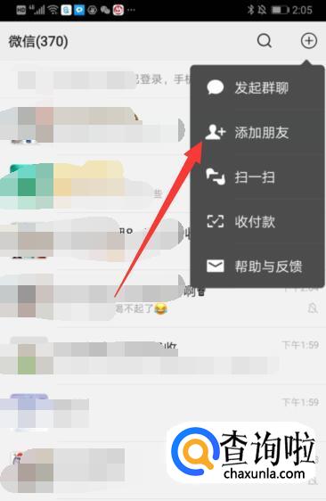 首先打开微信,在右上角点击+号,选择“添加朋友”。