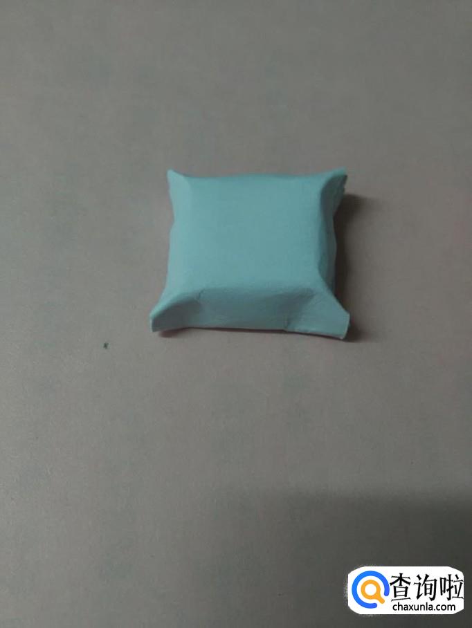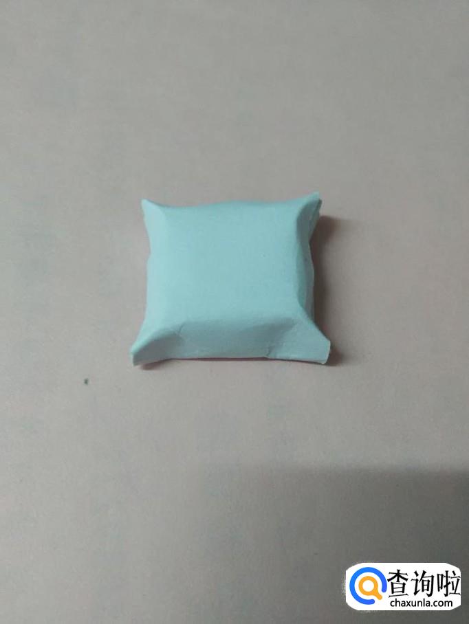用手将小正方形的四个角捏鼓,就成了一个小枕头。