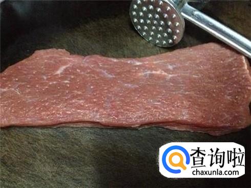 烤牛排之前,一定先要捶打牛排,可以用厨房工具进行捶打,或者用保鲜膜盖住牛排,直接用手捶打牛排,也是可以的。