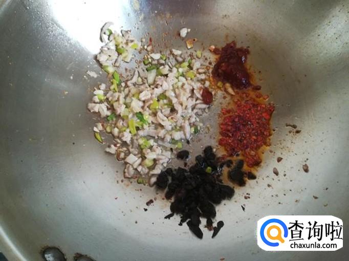 再加入1勺豆豉酱,1勺辣酱和少许干辣椒翻炒调味。