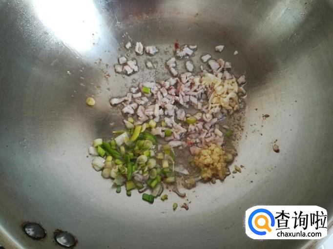 再加入葱、姜、蒜末炒出香味。
