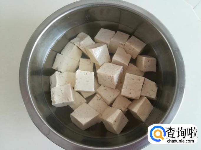 把豆腐切成小块,在开水锅里焯一下水捞出放盆里。