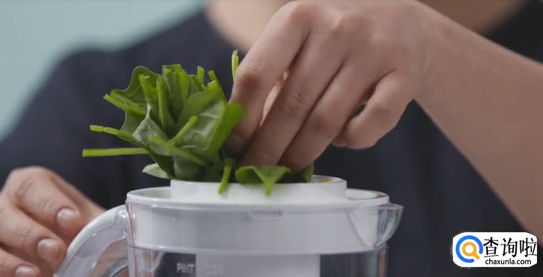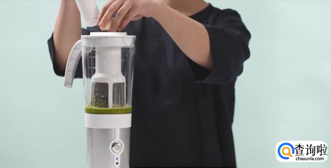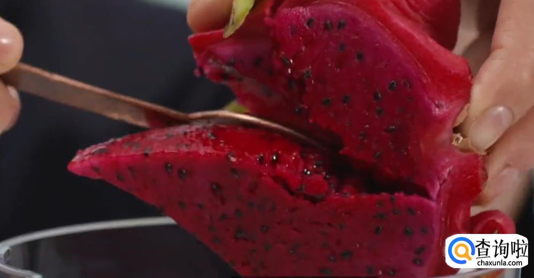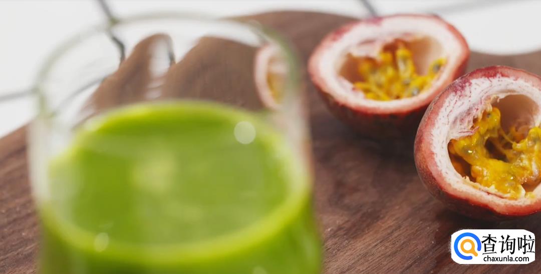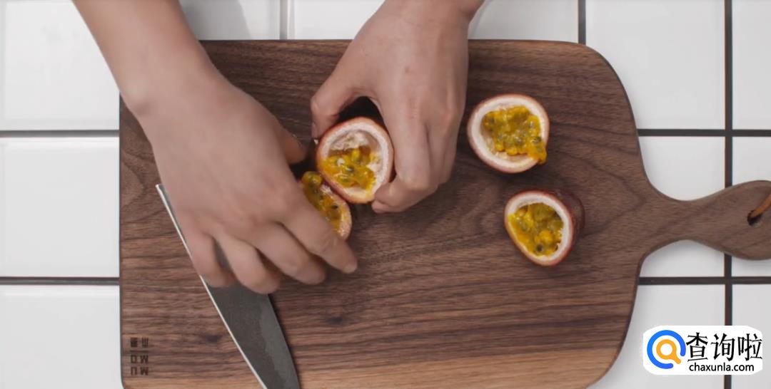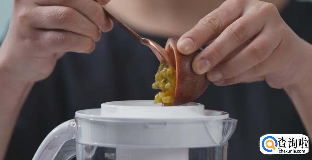将百香果洗净刨半,将果肉倒入榨汁机中。