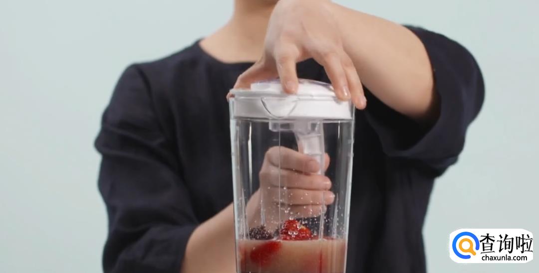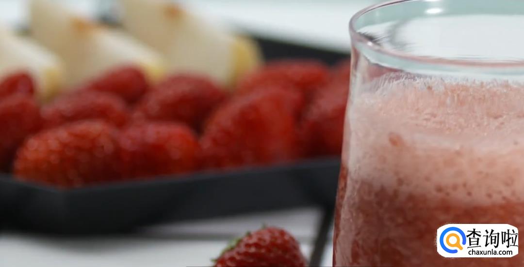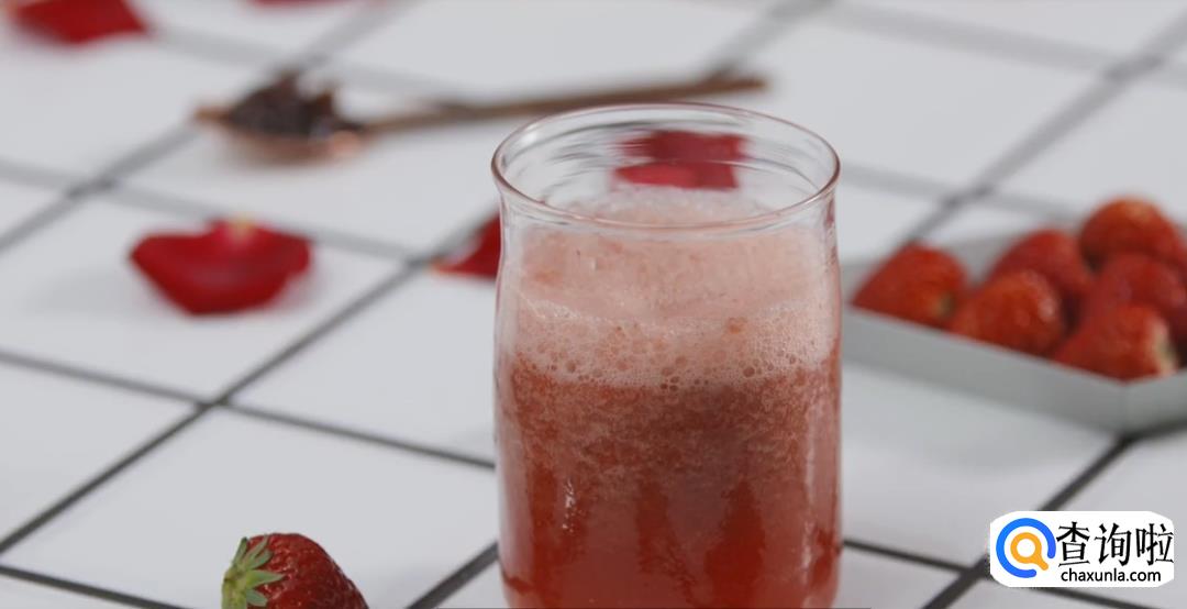 将过滤后的梨汁倒入榨汁机,加入草莓和一勺玫瑰酱,打碎装杯即可。