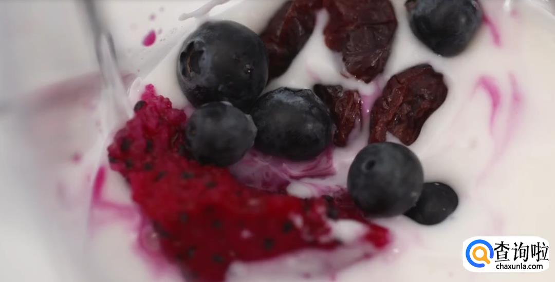 星夜与银河:酸奶300毫升,红心火龙果1/4个,蔓越莓干5克,蓝莓10颗,牛奶适量