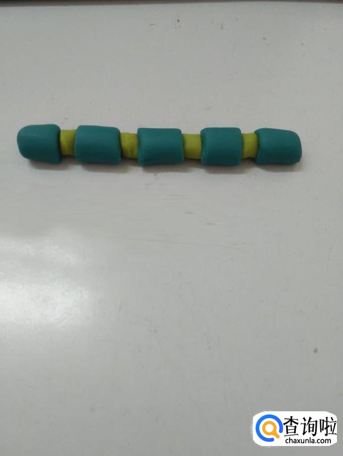 先将蓝色橡皮泥搓一个粗粗的、圆圆的长条。
