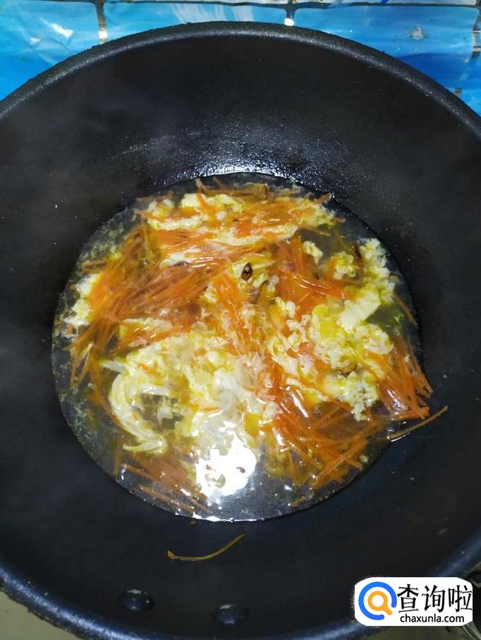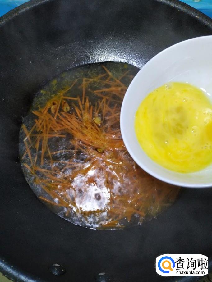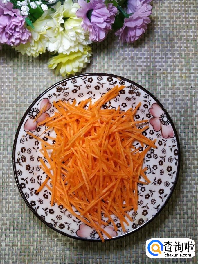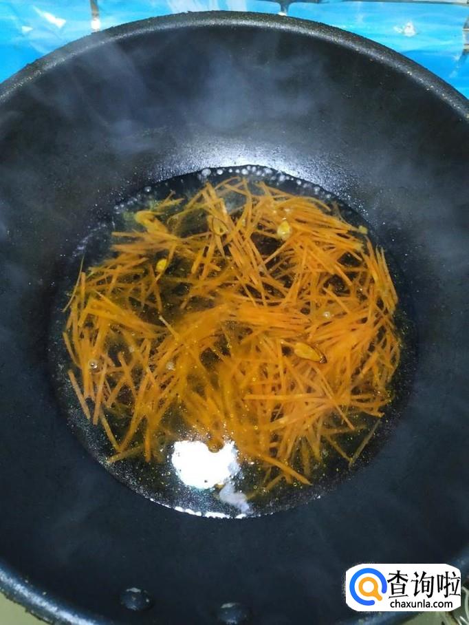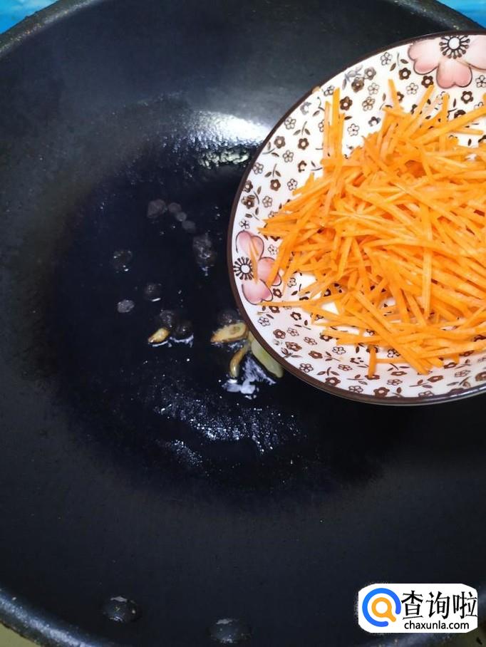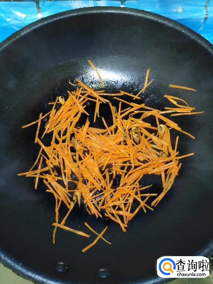准备适量胡萝卜,洗净去皮后,擦成细丝,放入盘中备用,然后将准备好的胡萝卜丝倒入锅中,翻炒均匀,炒至胡萝卜丝变软就差不多了。