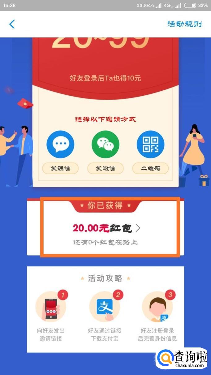 注意一定要叫好友通过自己的二维码来下载支付宝客户端哦!不然是没有奖励的,之后我们就可以在邀请界面看到自己的奖励了。