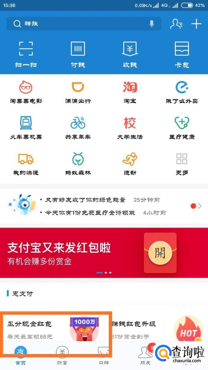 首先打开支付宝,我们是以老用户的客户端来操作的,在主页里面找到“瓜分现金红包”。