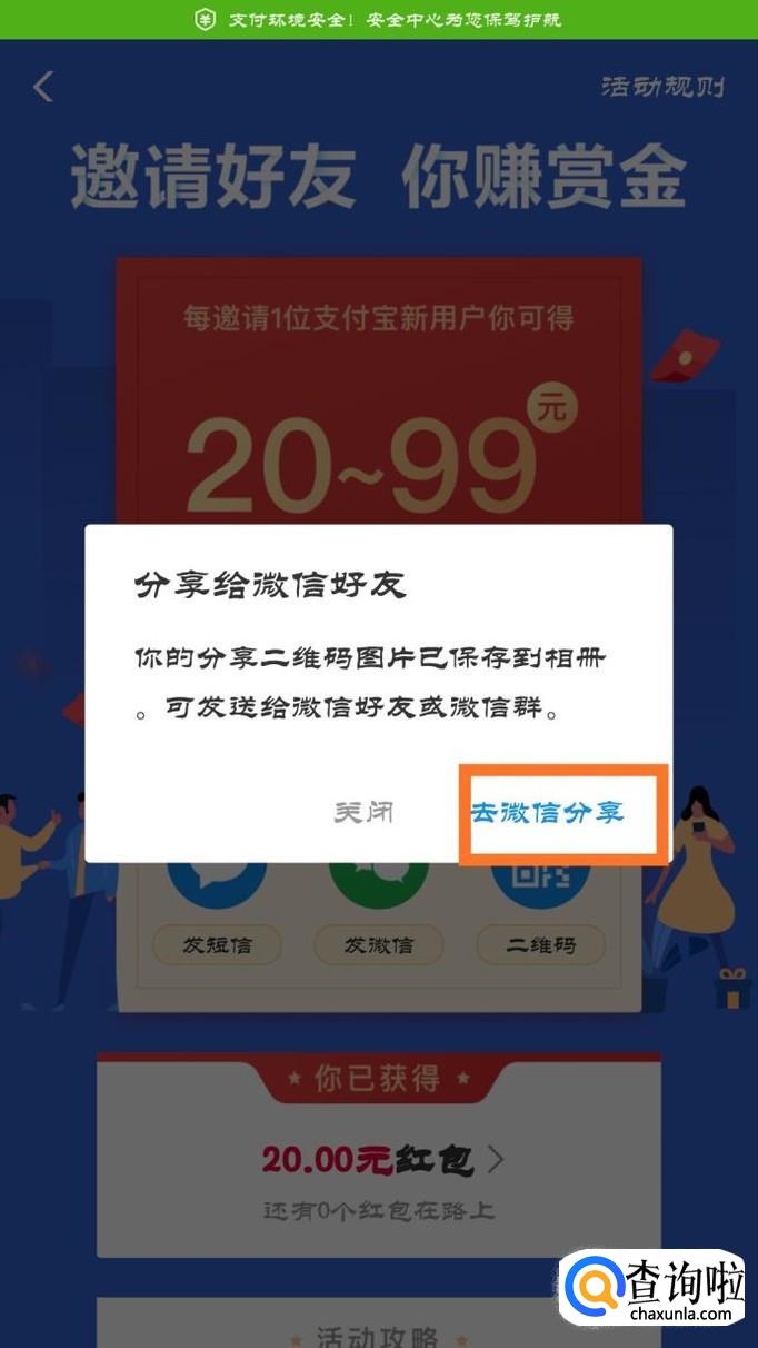 然后点击任意一个分享方式分享给从未注册过支付宝的好友,点击之后会生成二维码保存到手机相册里面。
