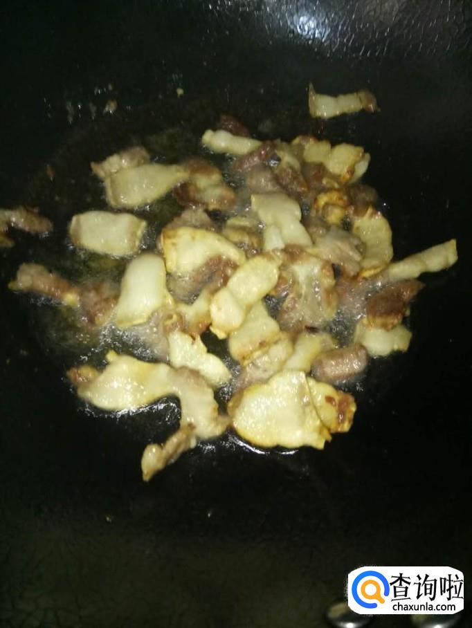 开火,加入适量的食用油,待锅里油温较高时,将五花肉下入锅里煎出油为止;可以将火调为中小火,比较不容易焦;