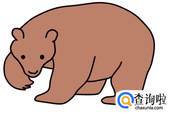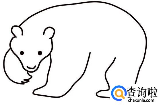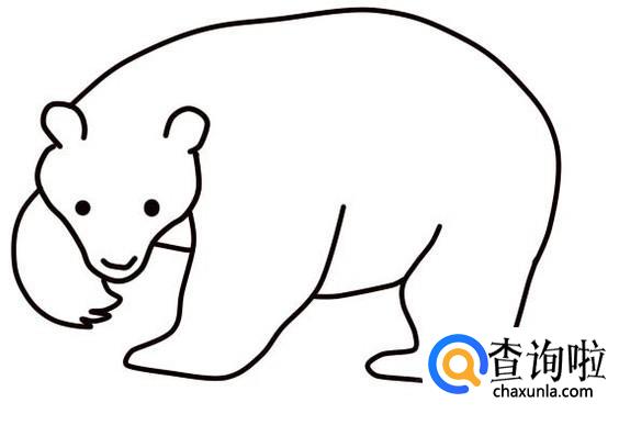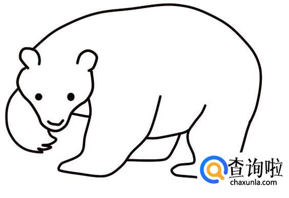 从脸的右侧再画一条粗壮的上肢,下方画得向左突出一些,表示它的熊掌。屁股向左,再画一条粗壮的下肢,下方也平着画出脚掌。