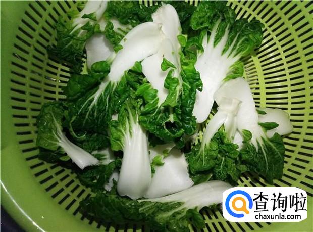 把奶白菜的叶子一片片摘下来,清洗干净,沥干水分,备用。