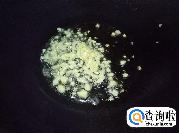 把锅烧热后,倒入适量的花生油,然后放入蒜蓉煸香,再把奶白菜倒入锅中,大火翻炒均匀。