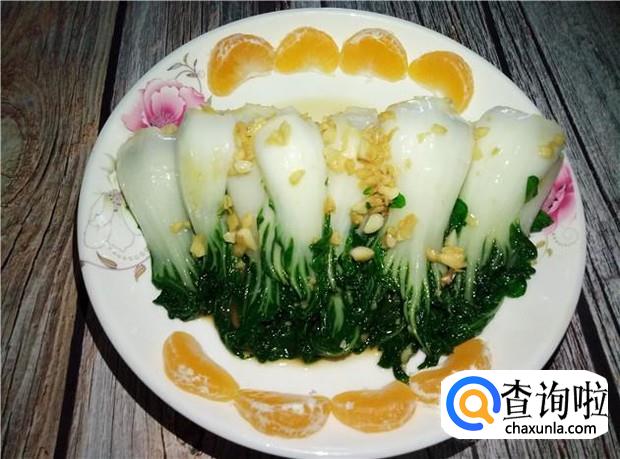 用小橘子装饰碟子,然后把奶白菜均匀铺在碟子中间,美味的蒜香奶白菜就做好了。