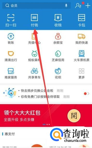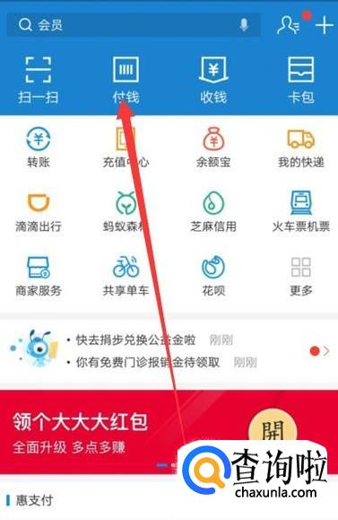 在支付宝首页面,点击“付钱”,进入下一页面,如图所示。