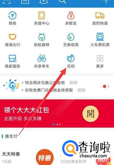 进入之后,在首页找到花呗,点击并进入,如图所示。