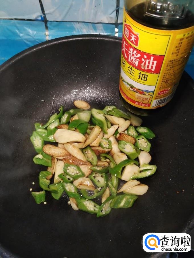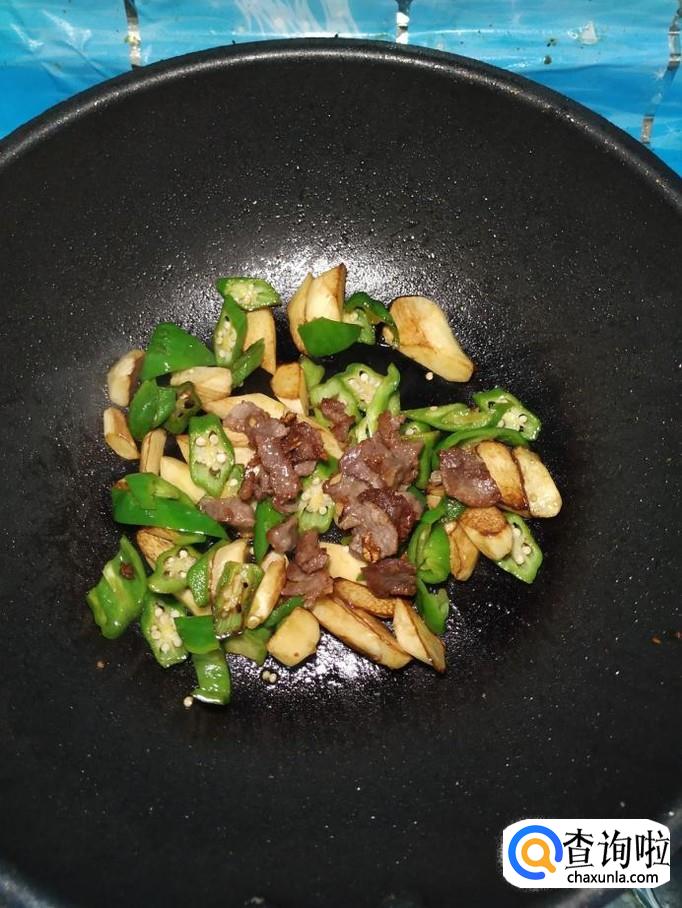 将准备好的秋葵和青椒倒入锅中,和茭白一起翻炒均匀。