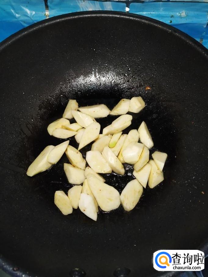 锅中留底油,油热后,将茭白块倒入锅中,小火慢炒,炒至表面微微变色。
