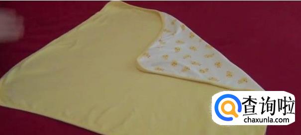 首先把包襁褓的毛毯平铺到床上,然后把毛毯的其中一角折到上下两个角的对角线中间的位置。
