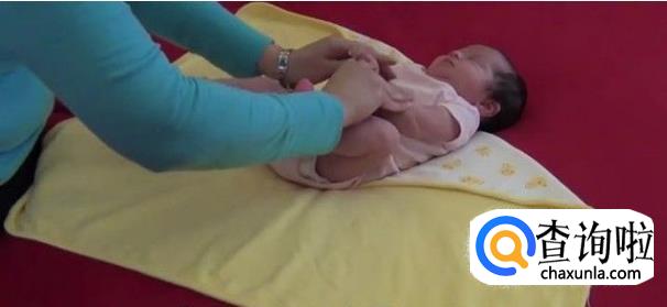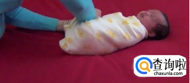 然后把小宝宝放到毛毯上,此时小宝宝双手会乱抓,为了怕宝宝抓到自己,要把宝宝的双手放到宝宝胸前然后再开始包毯子。