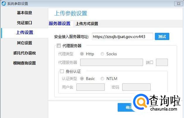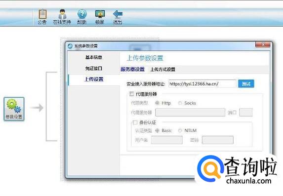 在参数设置页面,点击第三项上传设置,然后点击右侧的服务器设置,看看服务器的地址是否对,如果不对,需要问税务局,填入正确的服务器地址,然后点击右侧的测试按钮。