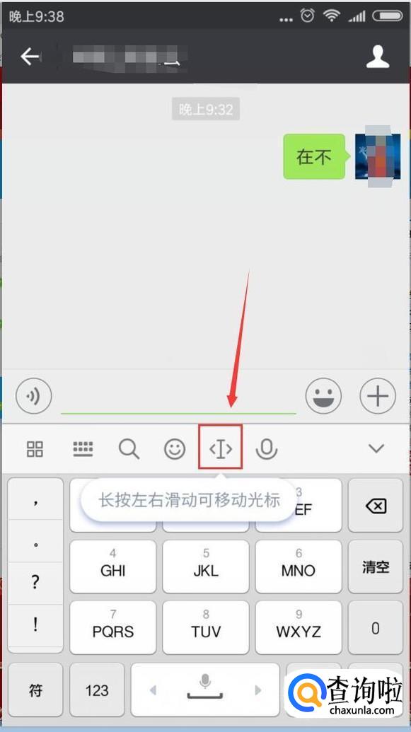 如下点击的是一个“长按左右滑动可移动光标”按钮,点击它进行移动聊天窗口键盘方向等明细操作。
