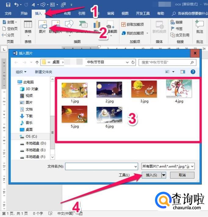 打开word文档后直接插入所有图片,如果按照一般的方法就是一张一张插入,再编号,但那样实在太烦琐了。【插入】---【图片】---选择文件夹---Ctrl+A选择所有要插入的图片,点击【插入】即可