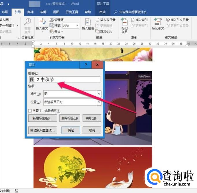 图片的名称就在题注框里设置,将光标定位在题注框,直接输入图片名称,如“嫦娥奔月”,点击【确定】。第一张图片设置完成。