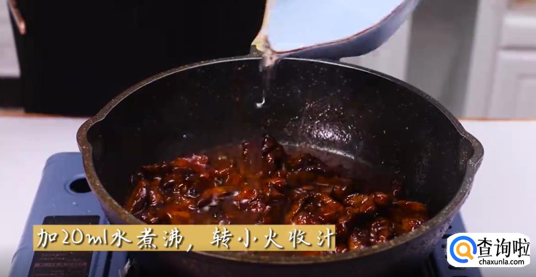接下来,往锅中倒入20ML的清水,待水煮沸后,转至小火收汁。