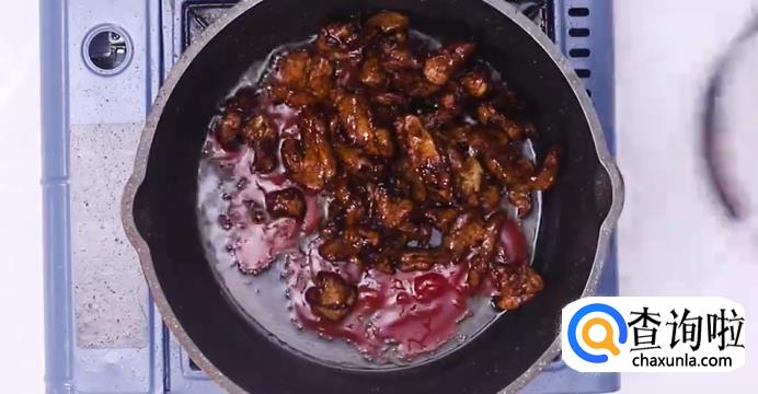 将沥好油的里脊肉放进去,和酱一起混合翻炒。