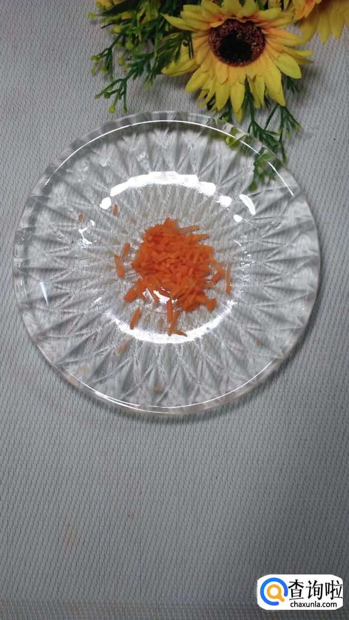 准备适量胡萝卜,洗净后擦成丝,切成末,撒在上面,就可以吃了,美味营养,家里人都非常喜欢。