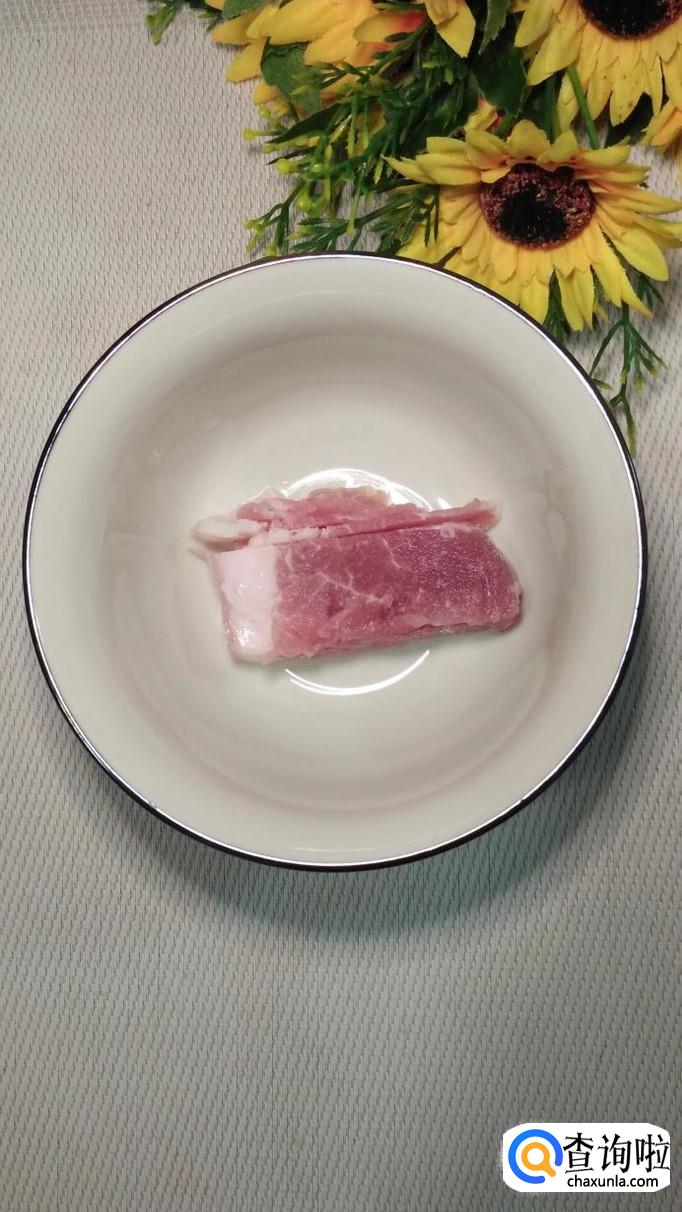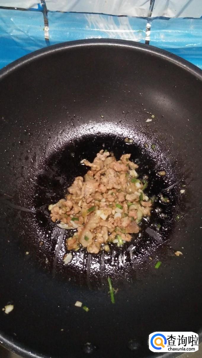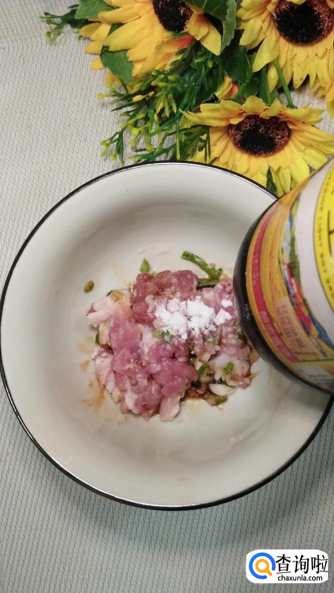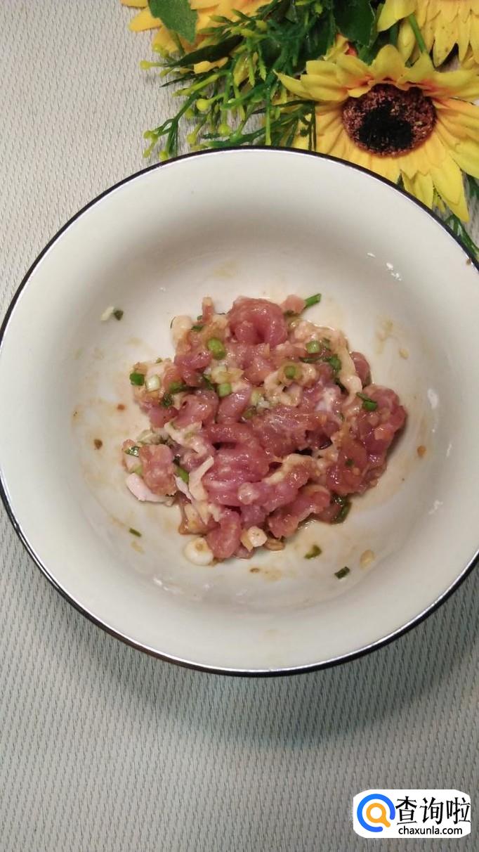 准备适量五花肉,洗净后切成丝,放入适量葱末,姜末,蒜末,盐,鸡精,五香粉,生抽,料酒,淀粉,搅拌均匀,腌制十分钟。