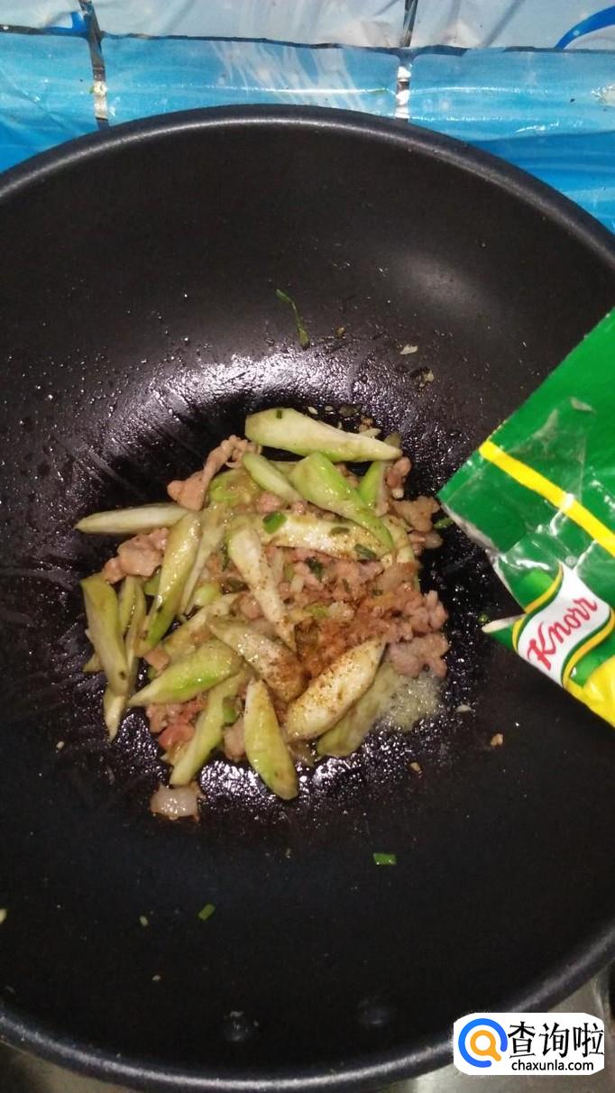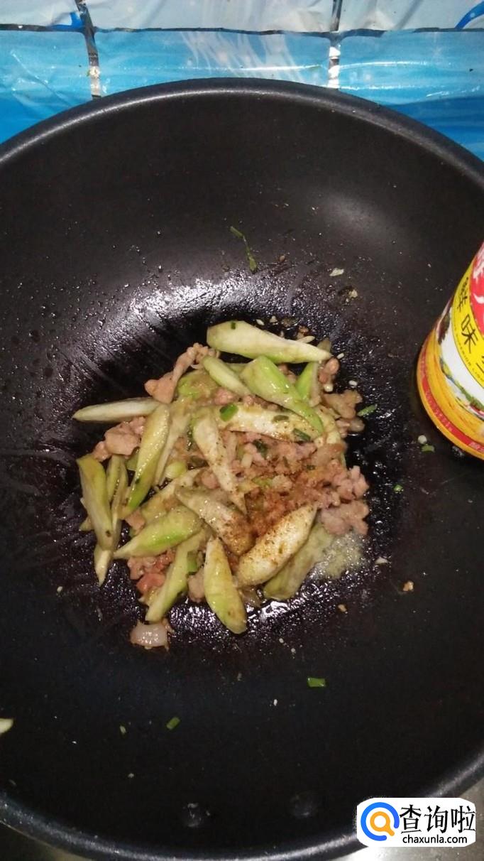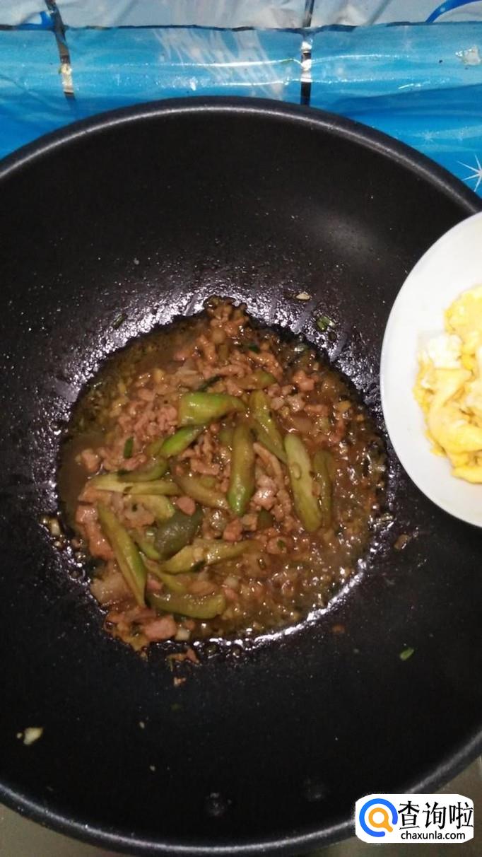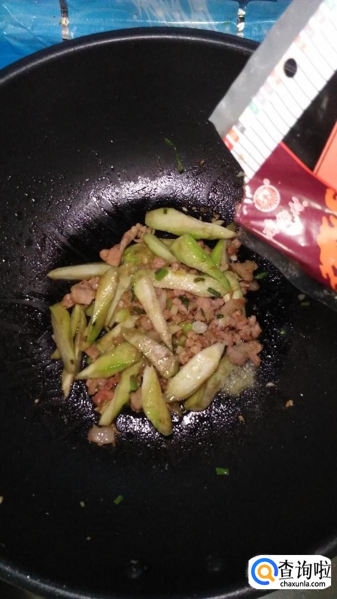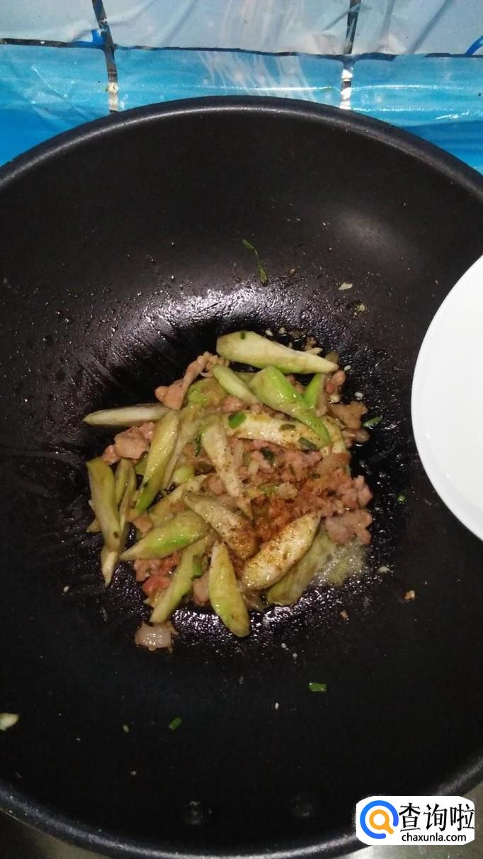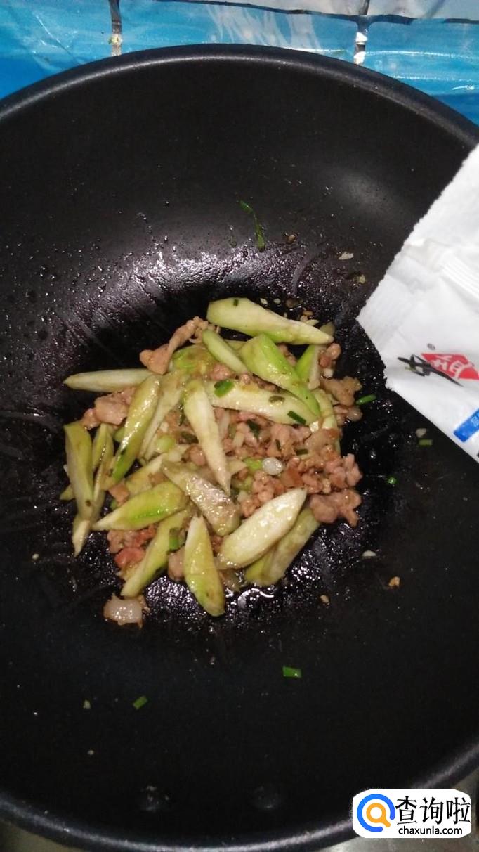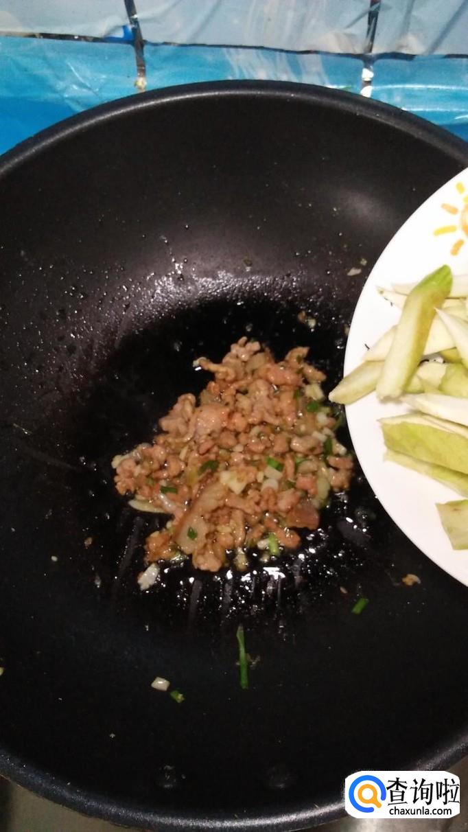 锅中再放入适量油,将五花肉倒入锅中炒熟,然后将丝瓜倒入锅中,和五花肉一起翻炒均匀。