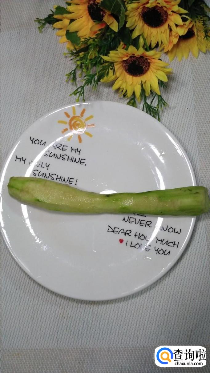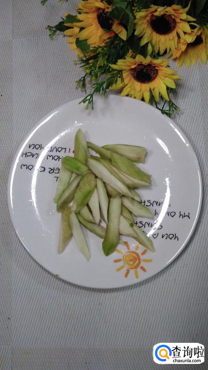 准备一根丝瓜,洗净后去皮,切成滚刀块,放入盘中备用,丝瓜的外皮比较硬,所以一定要去掉,选用丝瓜的时候最好选用新鲜的丝瓜,否则,丝瓜的内瓤太老,咬不动。
