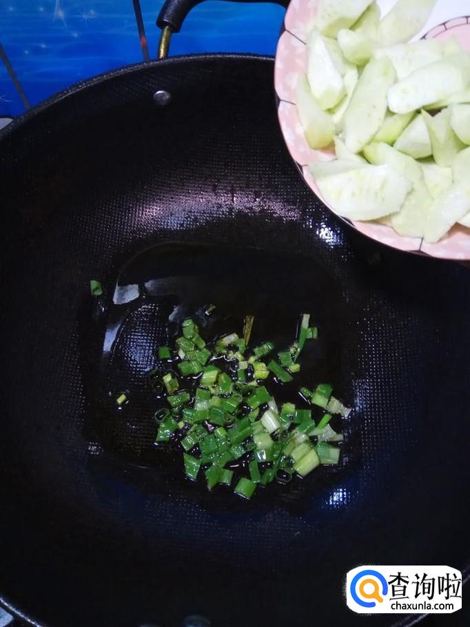 将准备好的丝瓜倒入锅中,翻炒均匀。