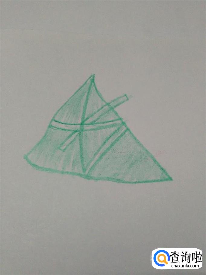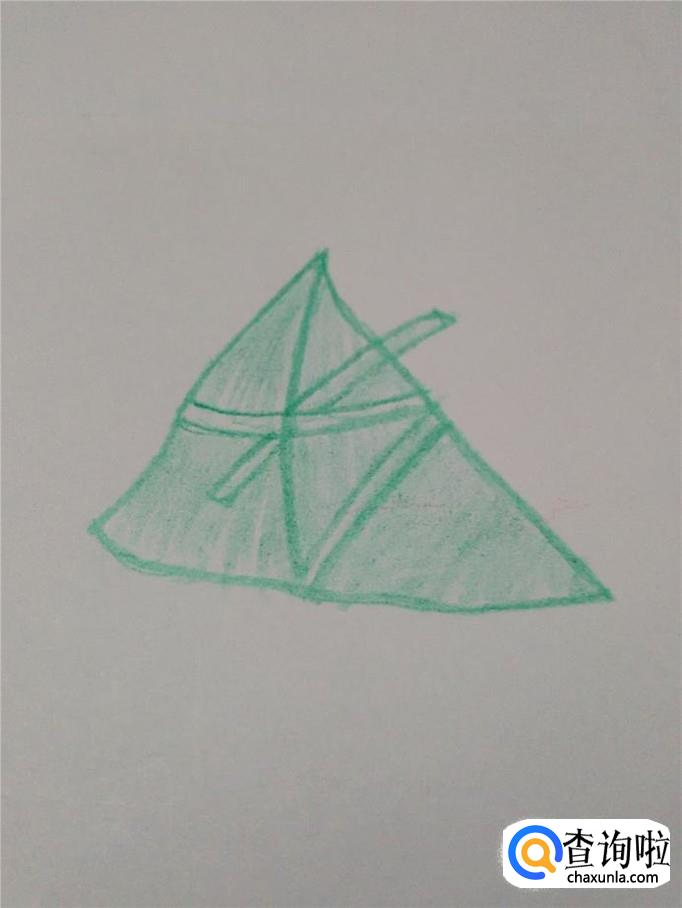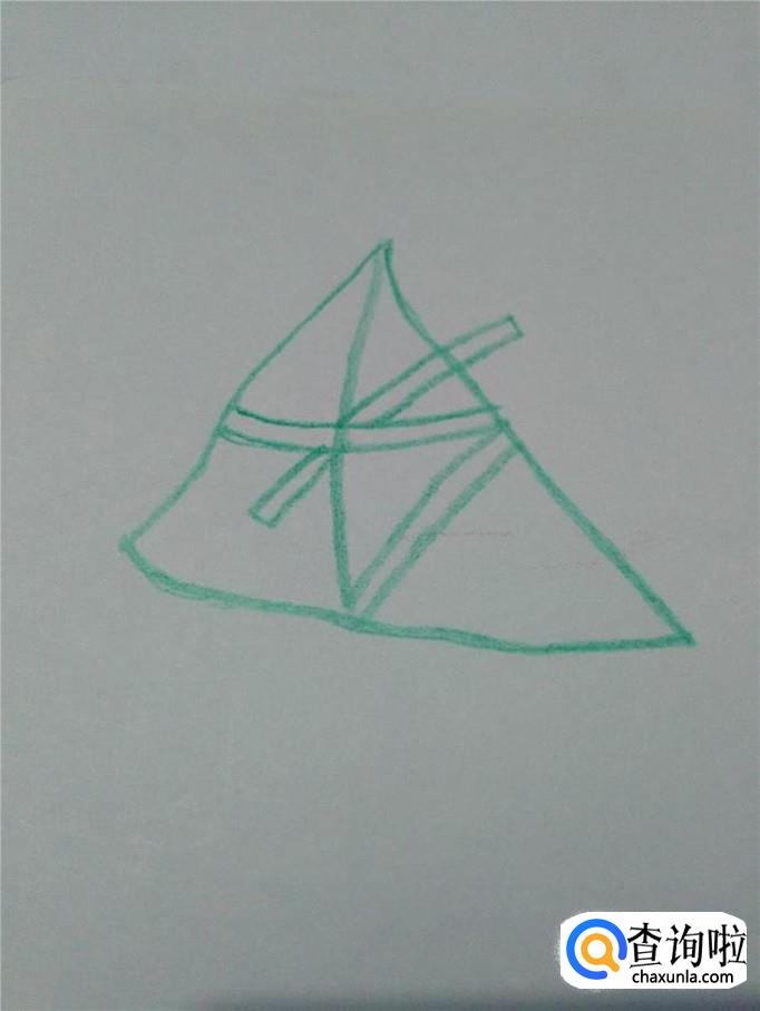 用笔在三角形上画三条双线,表示系粽子的草绳,横着画一条,斜着画两条,其中一条斜线和横线相交,表示打结的地方。