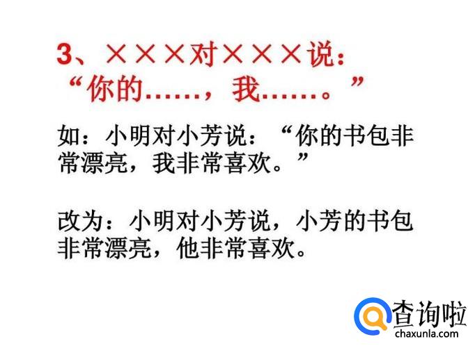 比如说,别人要我们传达:我要去看电影,不来开会了。改为转述句就需要将第一人称我改为第三人称她/他。即:他/她要去看电影,不来开会了。