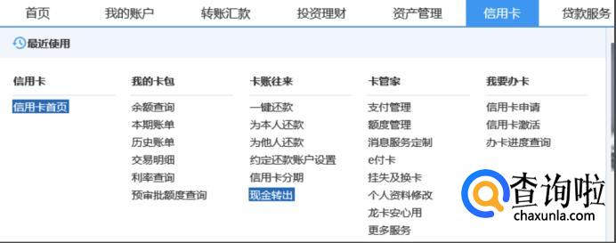 登录之后,选择单击“信用卡”——“现金转出”,这里的信用卡都是可以进行提现的,只不过各个银行的额度不同。