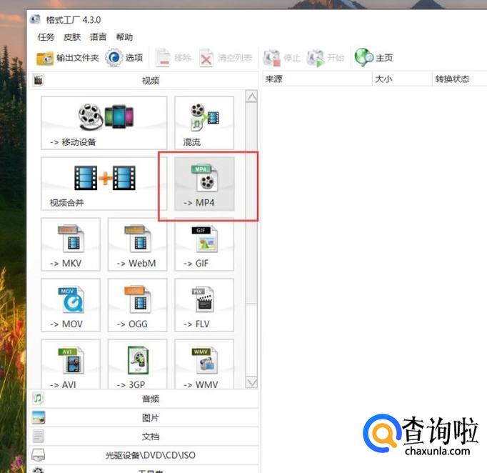 打开格式工厂软件主页面,点击页面中的“视频”菜单选项,并选择好要进行转换的格式。