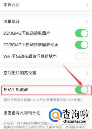 将摇动手机截屏功能打开,注意如果你的手机已经开启root权限,可以在QQ以外的界面使用,如果没有就只能在QQ内部使用。
