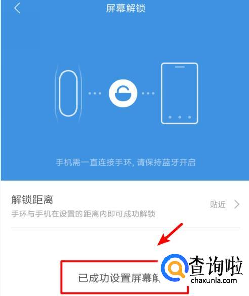 确定完毕后可以看到已成功设置屏幕解锁,这时,将小米手环4靠近手机时即可解锁手机屏幕了。