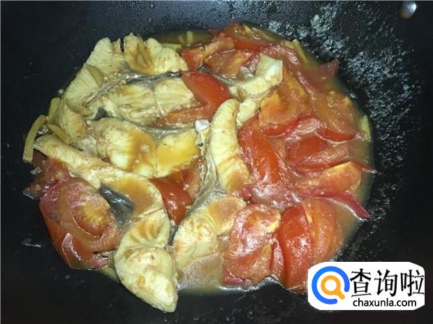 把鱼块煎到两面变硬后,就可以加入番茄,加入适量的水和酱油,盖上锅盖大火烧。