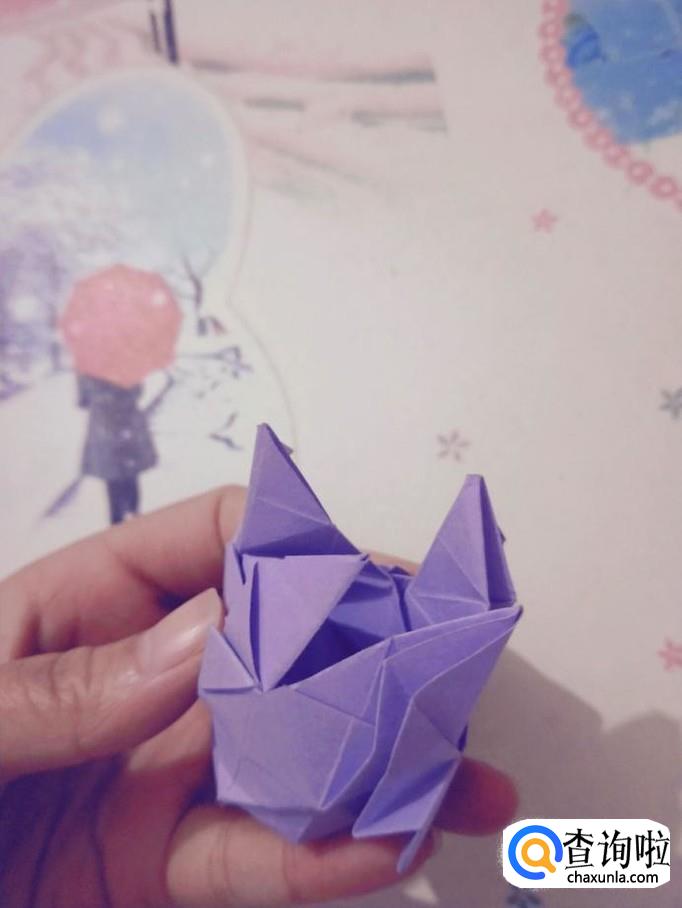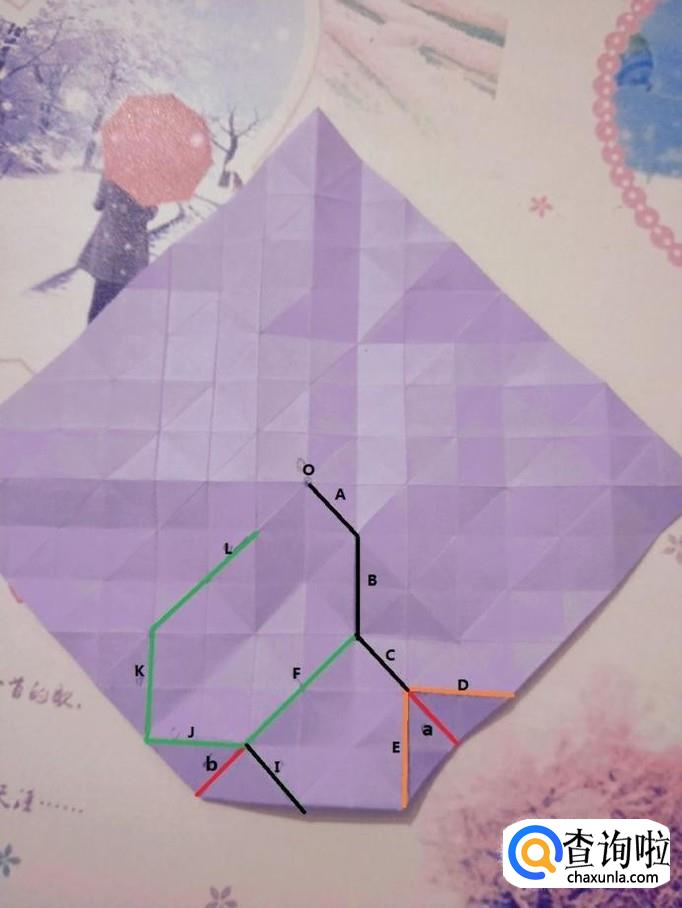 沿着标注折叠折纸。折痕红色的”a“、”b”为反折的边;绿色和橙色为分别重合的边。如”K“与”J“重合,”L“与”F“重合,”D“与”E“重合。