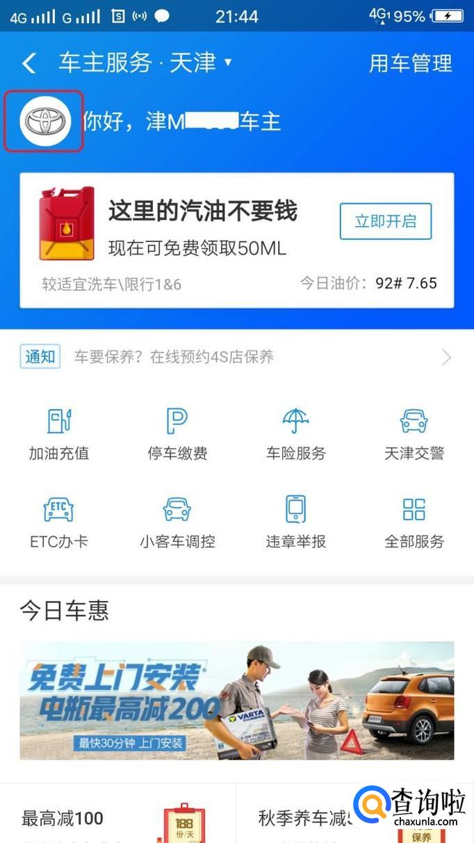 只要使用过支付宝为加油卡充值等,就会留有车牌号等记录,我们要认证车辆及添加信息,需要点击图中标记的车标符号。