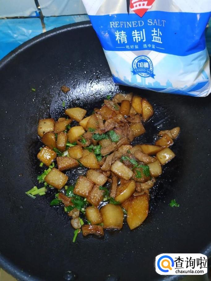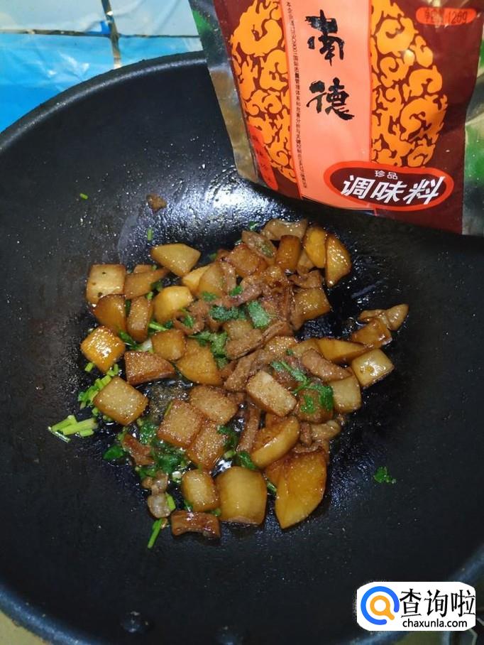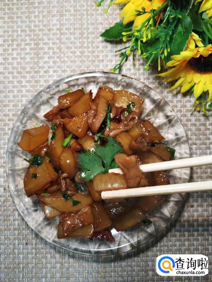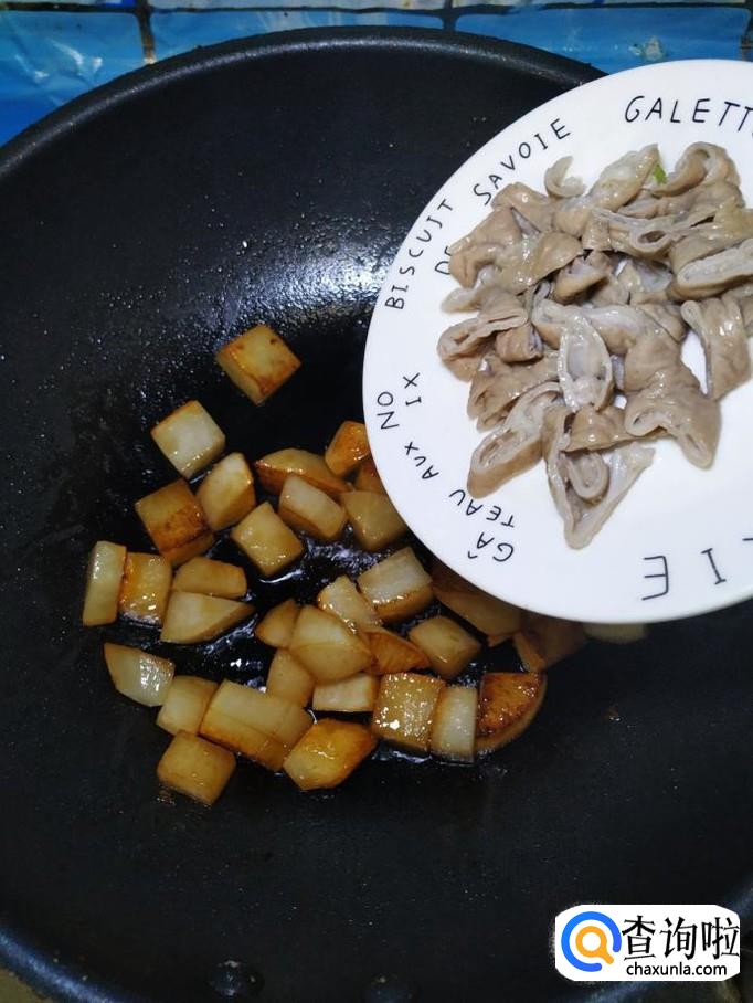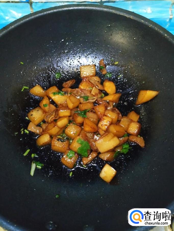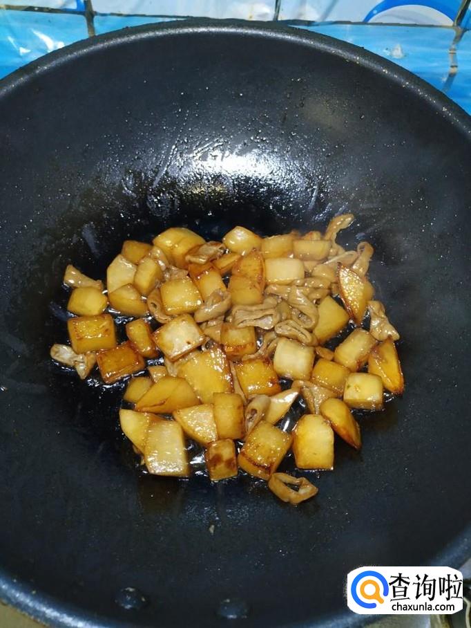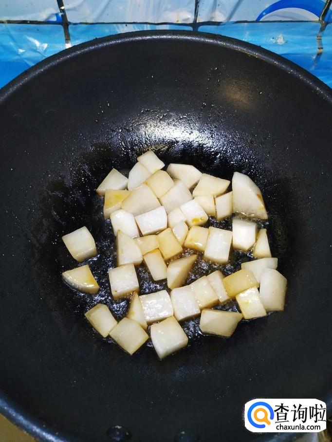 炒锅中放入适量油,油热后,放入适量冰糖,炒出糖色,然后将白萝卜放入锅中翻炒均匀。